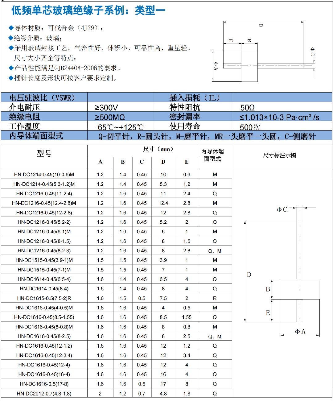 產(chǎn)品描述:介質(zhì)耐壓≥300V 絕緣電阻≥5000MΩ 密封漏率:≤1.013×10-3 Pa·cm3 /s(He) 工作溫度:-65℃~+155℃ 導體外徑、高度及插針的直徑、形狀和長度均可按客戶要求定制