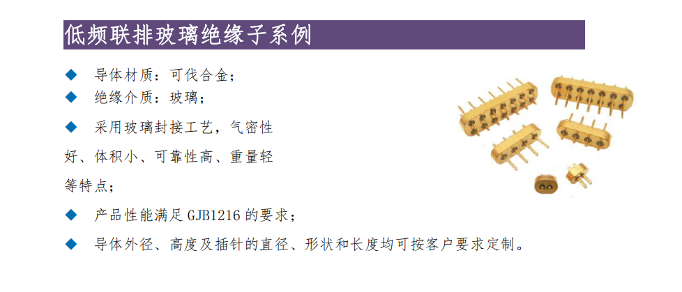 產(chǎn)品描述:聯(lián)排4插針 介質(zhì)耐壓≥500V 絕緣電阻≥1000MΩ/DC250V 密封漏率:≤ 1×10-9Pa.m3/s(He) 工作溫度:-55°- 165°導(dǎo)體外徑、高度及插針的直徑、形狀和長度均可按客戶要求定制